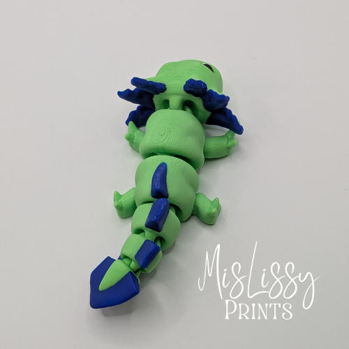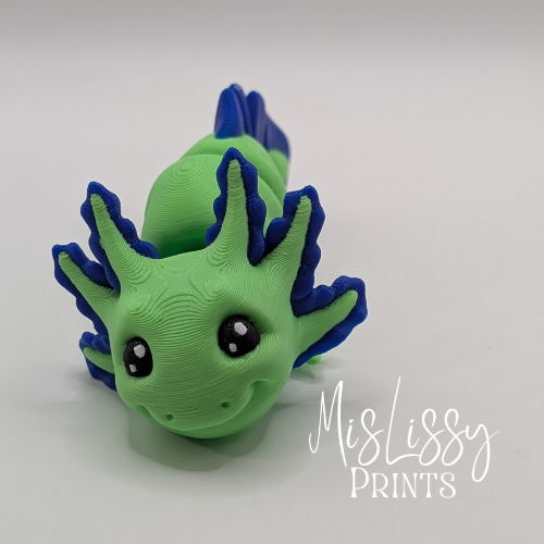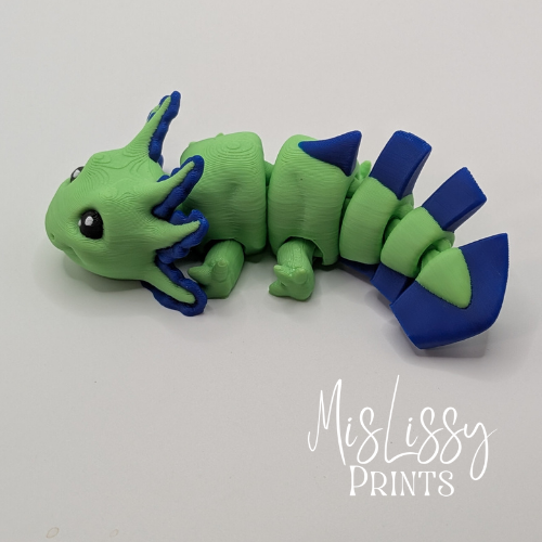 Featuring a light green body with blue gills and fins, this axolotl stands out without being over the top. The color contrast highlights its unique shape while keeping the design playful and eye-catching.