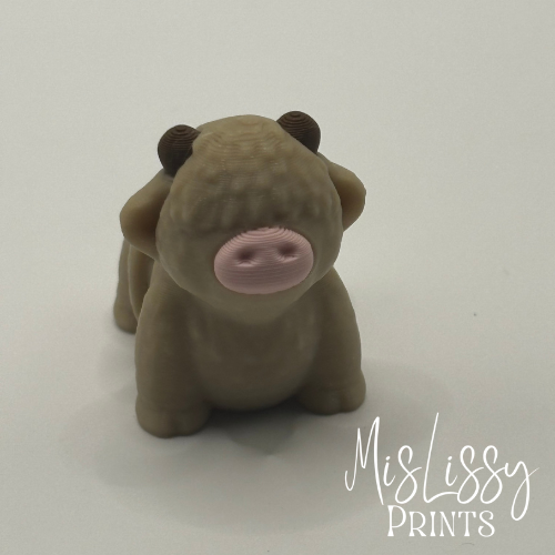 Soft, friendly, and full of charm — this little highland cow features a light brown body, dark brown horns, and a sweet pink nose. It’s the kind of piece that makes you smile without even realizing it — simple, comforting, and just plain cute.